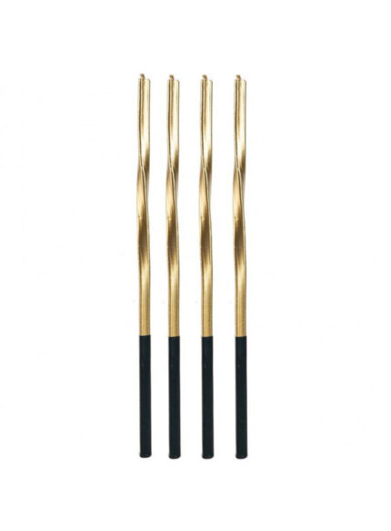 Vela Torcida Metalizada – Ouro 15 cm Design Torcido Exclusivo: O formato em hélice acentuada cria um jogo de luz e sombra em suas facetas, proporcionando um efeito visual dinâmico que se destaca na decoração da confeitaria.