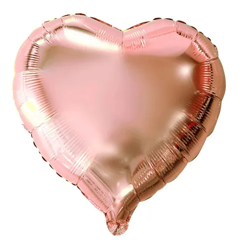 O produto é um balão metalizado em formato de coração na cor rose gold, popularmente usado para decoração de festas e eventos