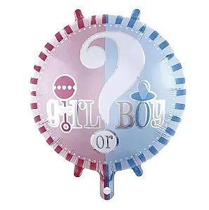 Este item é um balão metalizado “Girl or Boy” (Menina ou Menino) utilizado em festas de chá revelação.
