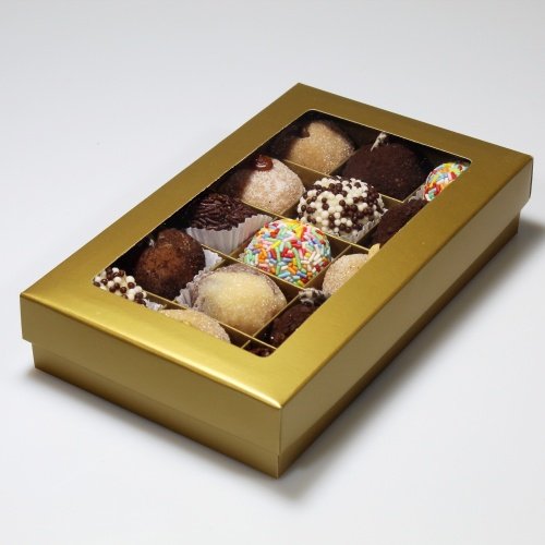 Caixa com 15 divisórias em acabamento dourado, sofisticada e elegante, ideal para doces finos, bombons e brigadeiros gourmet.