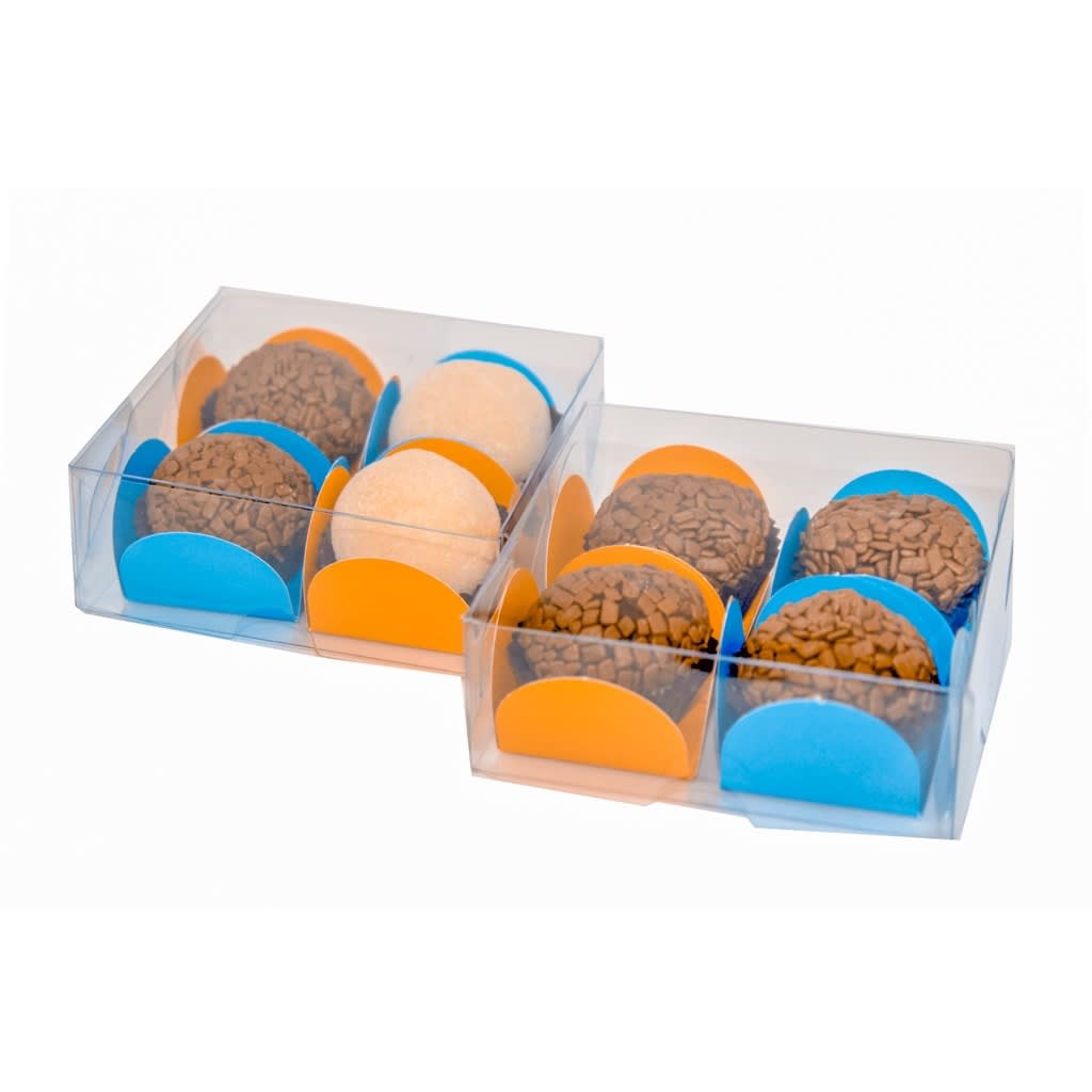 Caixa em acetato transparente para 4 doces, valorizando a apresentação e protegendo os produtos.