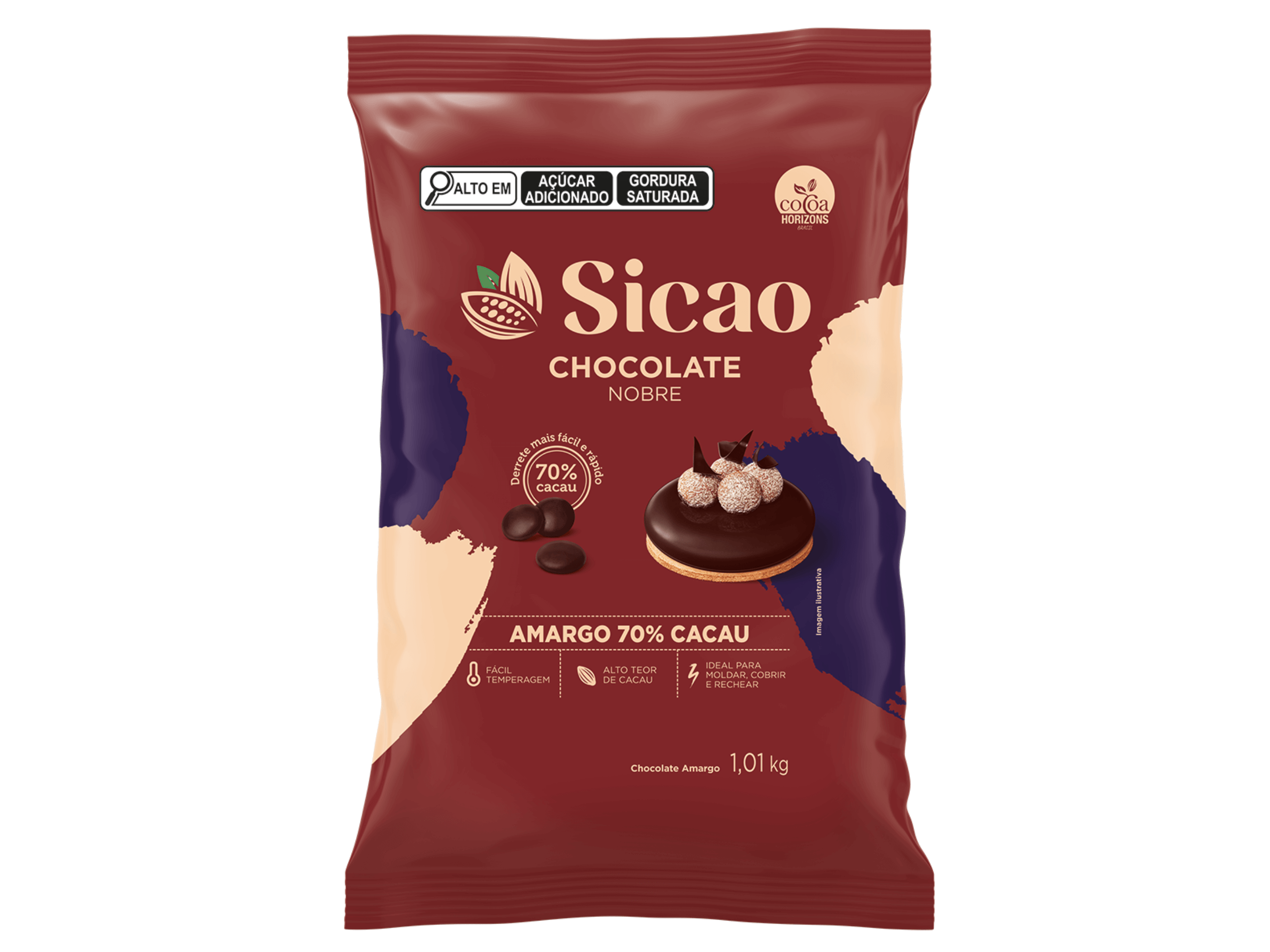 O Sicao 70% Cacau da linha Seleção é a expressão máxima do chocolate intenso. Desenvolvido com tecnologia de origem belga, ele entrega notas de cacau profundamente torradas e um amargor sofisticado. É a escolha ideal para produções de luxo, confeitaria funcional e para quem deseja oferecer uma experiência sensorial marcante e menos doce.