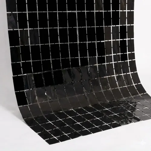A Cortina Metalizada de Quadrados Pretos é a definição de modernidade e atitude para a cenografia de eventos. Com um design geométrico de pequenos quadrados, ela foge do visual tradicional de franjas lisas, criando uma textura que remete a painéis de LED ou pixels, perfeita para decorações com um toque industrial, rock’n’roll ou de luxo noturno.