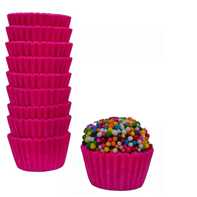 A forminha Pink N.5 é a preferida para criar contrastes ousados. Por ser da linha Lisa, ela oferece um ótimo custo-benefício para grandes eventos. Em tons escuros e vibrantes como o pink, a absorção de gordura (natural do papel comum) acaba sendo menos visível do que em tons claros, preservando a beleza da decoração por mais tempo.