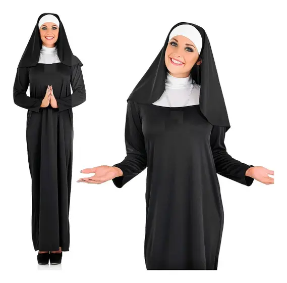 Entre no espírito assustador com o Kit Fantasia de Freira! Uma fantasia versátil e marcante, composta por vestido e véu para um visual completo.