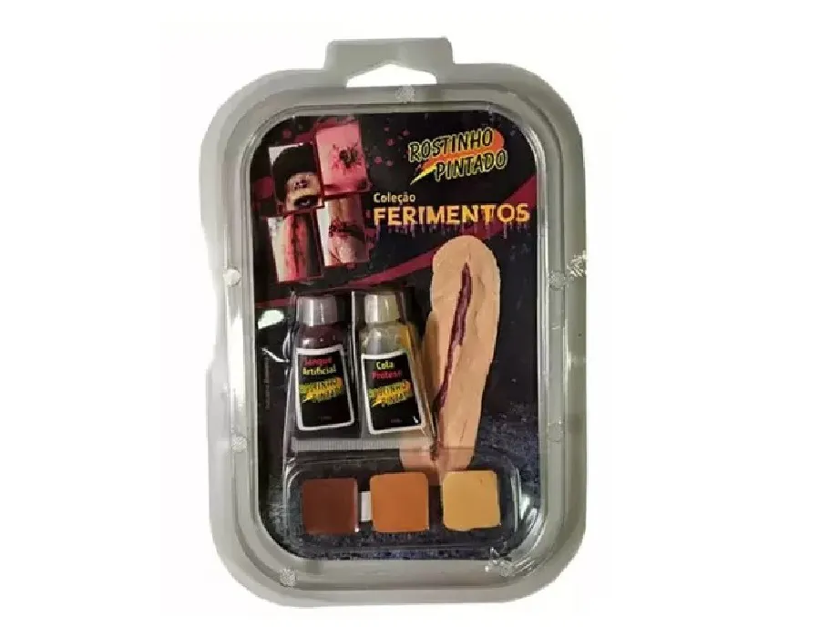 O Kit Corte Grande traz os itens essenciais para criar ferimentos cenográficos impressionantes. Inclui sangue falso, cola e molde de corte profundo.