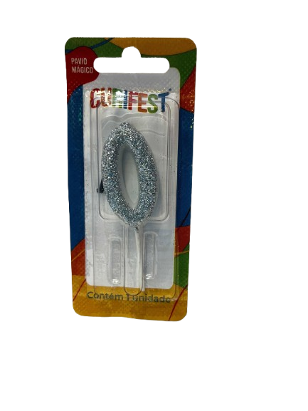 • Design: Vela em formato numérico (Número 0) com acabamento em “Puro Glitter” na cor prata, que proporciona um brilho intenso e uniforme.